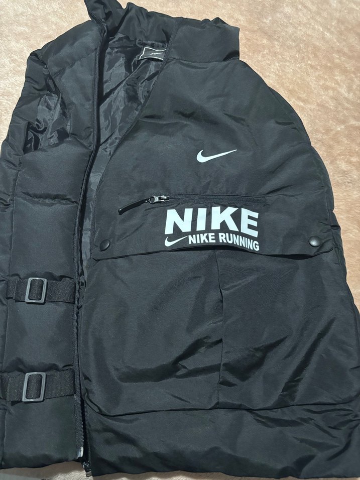 Nike siyah renkli, fermuarlı cep ve yüksek yakalı, kolsuz erkek yelek. Yumuşak dokulu kumaştan, fit kesim ve Nike Running baskılıdır.