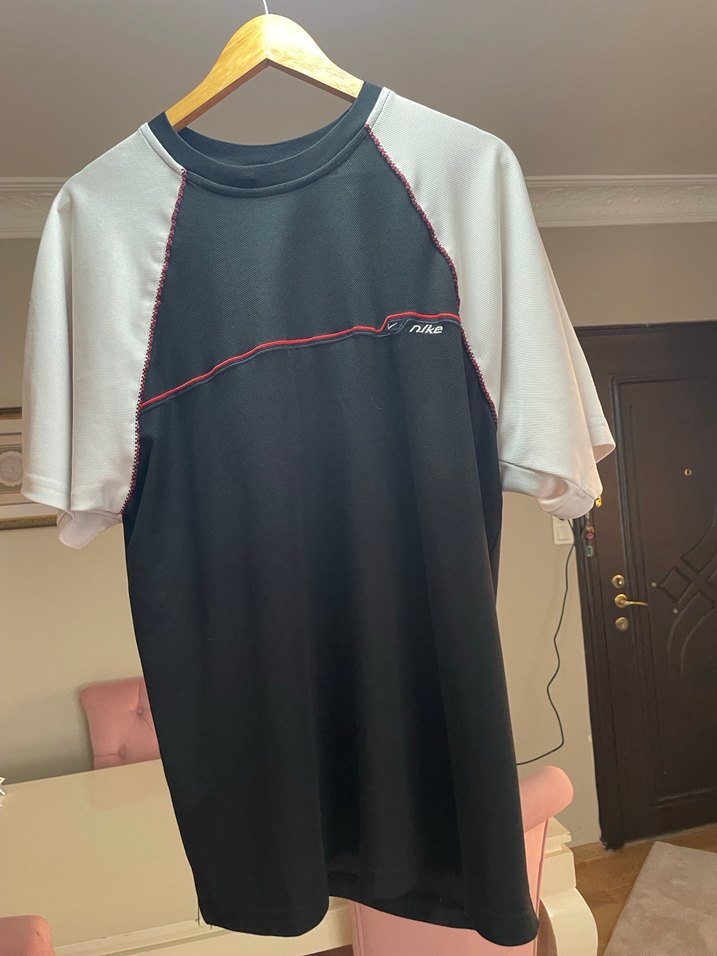 Nike erkek tişört, kısa kollu, yuvarlak yaka ve bol kesimdir. Siyah ve gri renklerde baskılı detaylar mevcuttur. Spor ve günlük stil için uygundur.