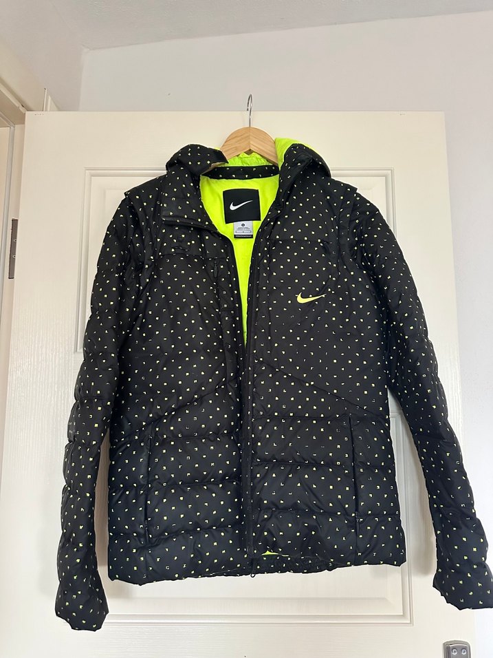 Nike marka siyah kapüşonlu kadın ceket, ince puantiyeli desene sahip. Uzun kollu, fermuarlı ve neon sarı iç astarlı günlük kullanıma uygun.