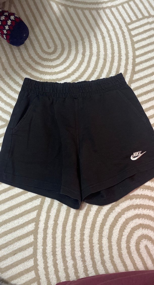 Nike markalı siyah mini şort, pamuklu kumaş ve rahat bol kesimiyle spor ve günlük kullanıma uygundur.