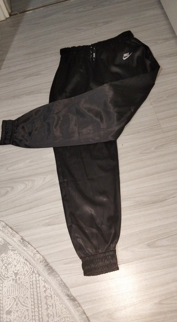Nike siyah kumaş pantolon, bol kesim ve fermuarlı ceplere sahip. Günlük rahat kullanım için uygun, orta boy ve lastikli manşetlidir.