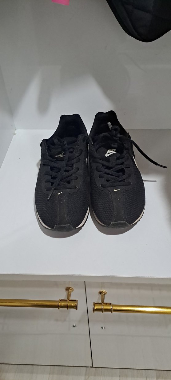 Nike siyah kadın spor ayakkabısı, düz kauçuk tabanlı, desen içermeyen sade tasarım, spor ve sokak stili için. Zahmetsiz şıklık sunar.