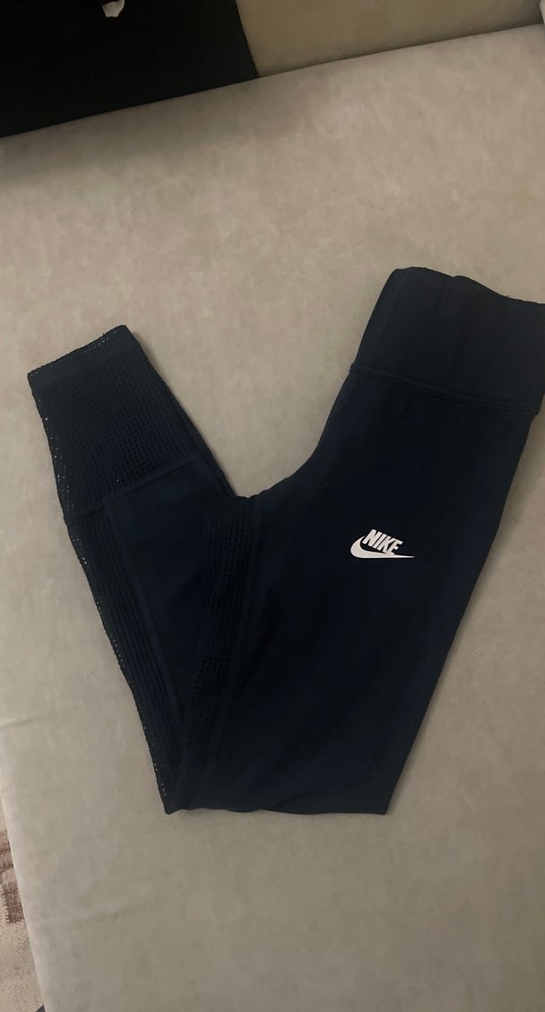 Nike marka siyah, elastik bel bantlı, midi boy, sentetik kumaştan yapılmış kadın spor taytıdır. ♀️