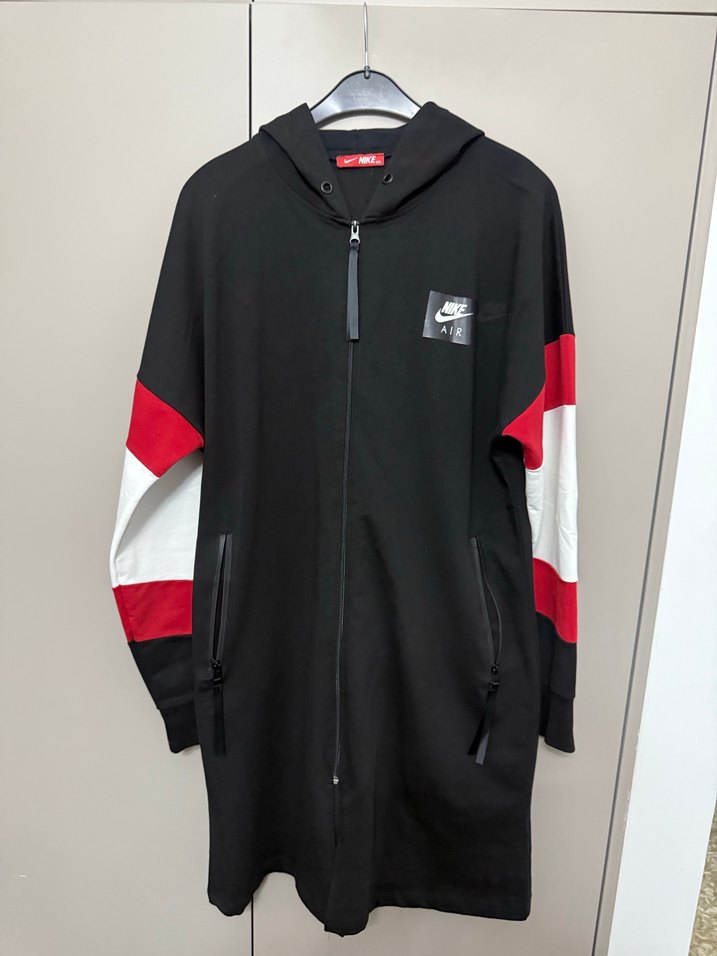 Nike siyah kapüşonlu, fermuarlı, kırmızı ve beyaz renk bloklu uzun kollu sweatshirt. Rahat kesim ve yuvarlak yaka, gündelik kullanım için uygundur.