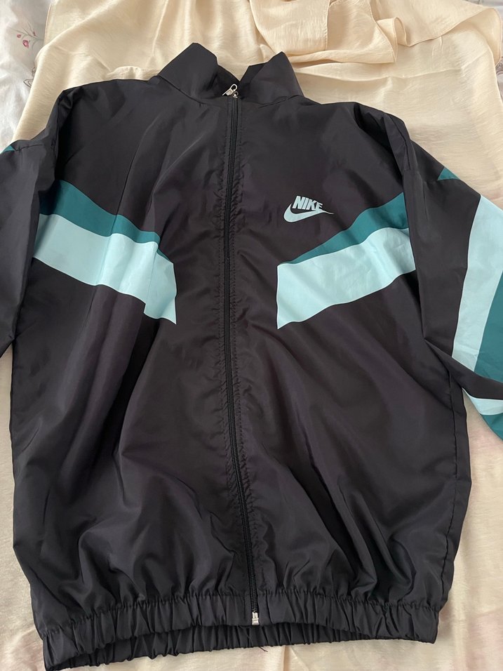 Nike siyah ve mavi renkli, yüksek yakalı, fermuarlı ve uzun kollu erkek spor rüzgarlığı. Sentetik kumaştan, midi boy ve dar kesim, spor ve günlük kullanıma uygun. Sıfır s m beden