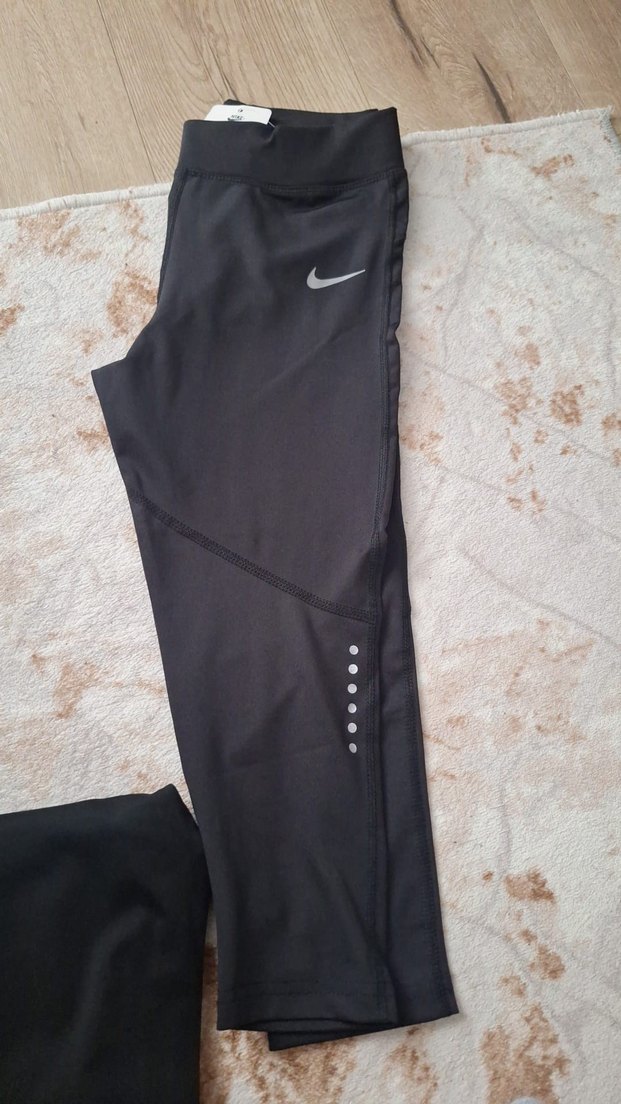 Nike markalı siyah midi uzunlukta, kesik detaylı, spor ve günlük kullanıma uygun sentetik kumaştan yapılmış dar kesim tayt.