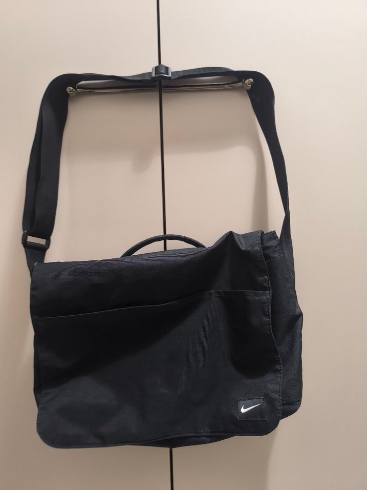 Nike marka siyah spor çantası, tokalı kapak ve ayarlanabilir omuz askısı ile minimalist tarzda tasarlanmıştır.