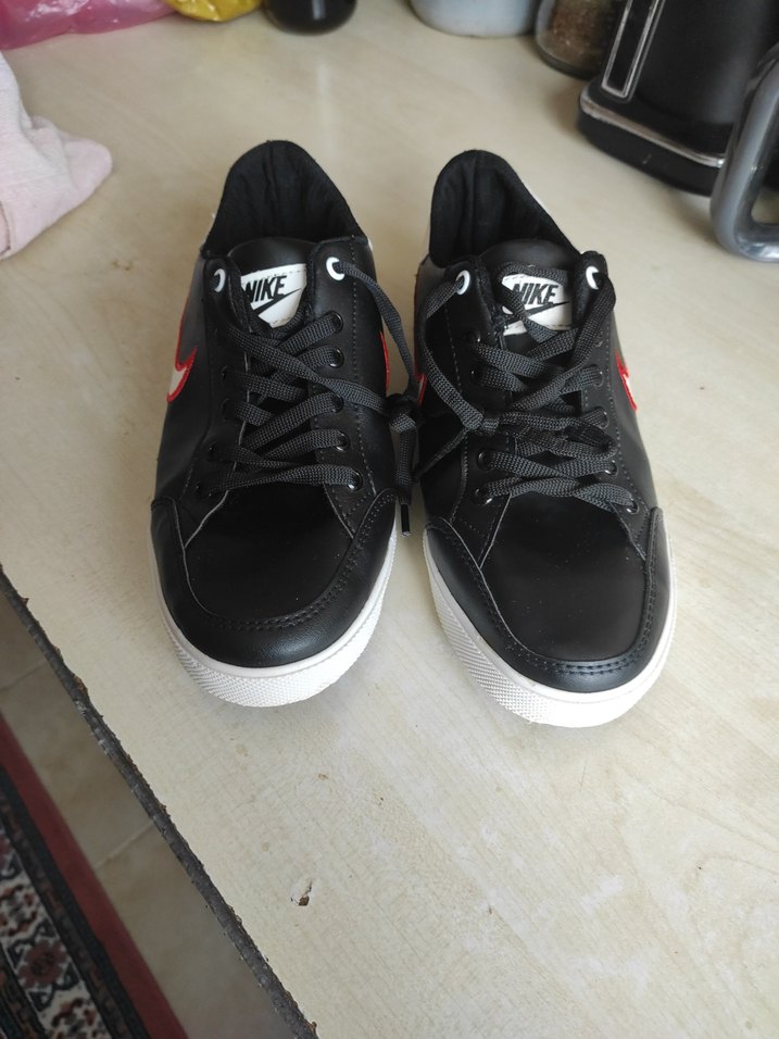 Nike marka, siyah renkte, kauçuk tabanlı spor ayakkabılar. Velcro ve bağcık detaylarıyla rahat ve güvenli kullanım sağlar. spor ayakkabı erkek için az kullanılmış arkadaki yazı biraz silinmiş ayakkabı yanıda çamaşır makinesinde yıkadım kuruturken biraz yanı sürtmüş fotoğrafta belirttim numarası da yazmıyor tahmini 40 numara