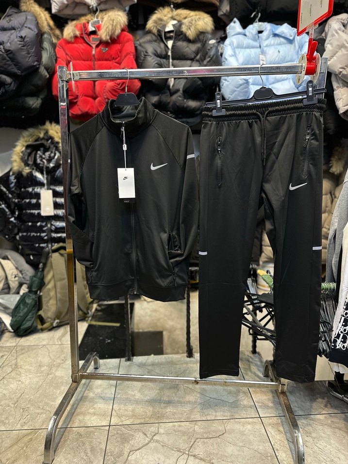 Nike siyah spor eşofman takımı, fermuarlı, bisiklet yaka ve uzun kollu ceketiyle birlikte gelir. Regular fit, sentetik kumaştan, spor ve streetwear tarzları için uygundur. S bedeni mevcuttur.