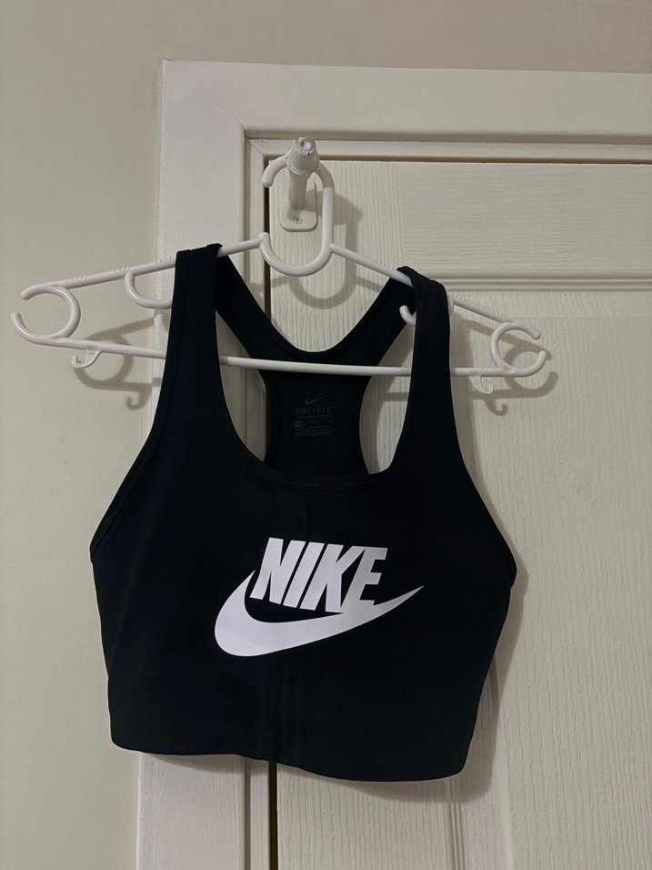 Nike marka siyah, kolsuz, yüksek yakalı ve vücuda oturan bustiyer. Baskılı logo ve ayarlanabilir cırt cırt detaylı. Kısa boy, spor ve sokak tarzı için uygun. Orijinal