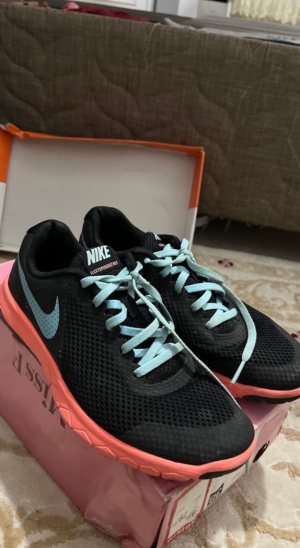 Nike kadın spor ayakkabısı, siyah file üst yüzey ve canlı turuncu tabanlı. Açık mavi bağcıklı, düz tabanlı, sokak giyimi ve spor için uygun.