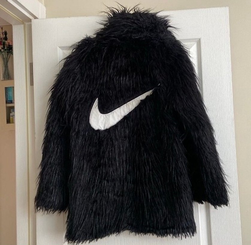 Siyah suni kürk ceket, uzun kollu, yaka detaylı ve vücuda oturan kesime sahip. Sırtında büyük beyaz logo figürü bulunur. Günlük kullanıma uygun. L beden ama kalıbı dar S-M uyumlı