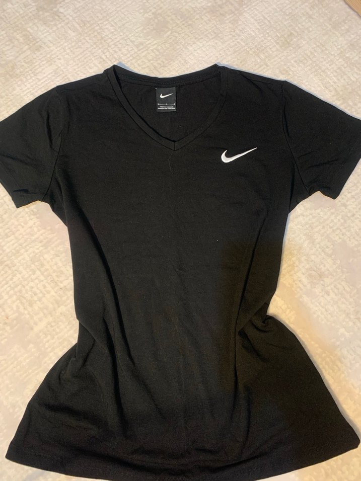 Nike marka, v-yaka ve kısa kollu, siyah renkli, ince ve yumuşak dokulu kadın tişörtü. Günlük sokak stiline uygun, sade ve şık görünümlü.