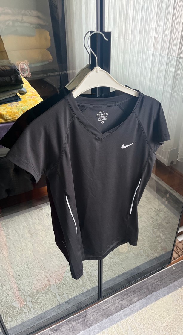 Nike siyah, v yaka, kısa kollu, dar kesim kadın spor tişörtü. Sentetik kumaştan, baskılı detaylı, şık ve sokak tarzı için uygun.