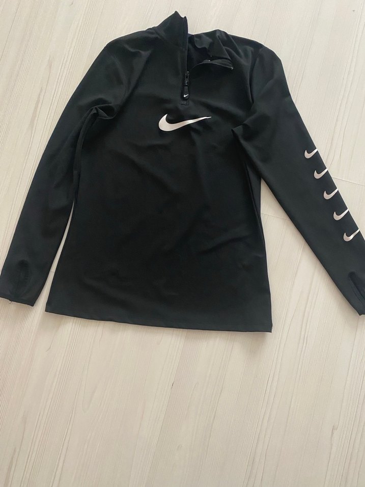 Nike siyah yarım fermuarlı sweatshirt, uzun kollu ve yüksek yakalıdır. Fit kesim, sentetik kumaş ve kolunda Nike logoları bulunur.