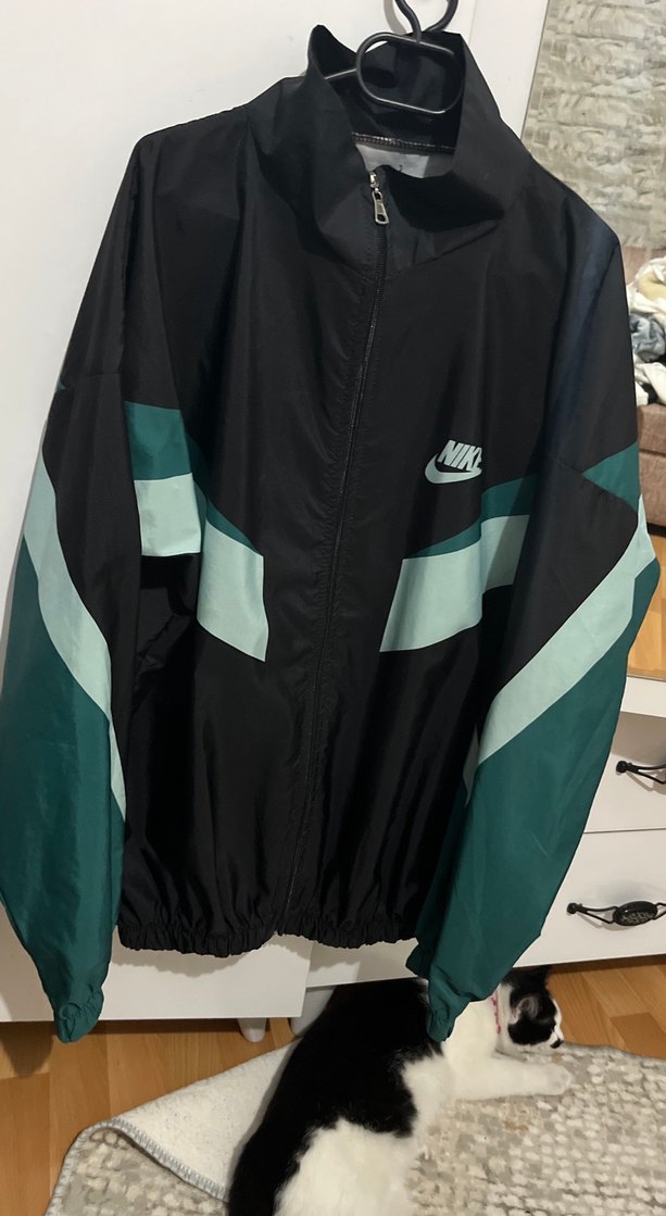 Nike eryağmurluk, yüksek yakalı ve uzun kollu, bol kesimdir. Yarım fermuarlı ve göğüs kısmında açık mavi şerit bulunur. Sentetik kumaştan, spor için uygundur beden yazan etiket sökülmüştür. ️