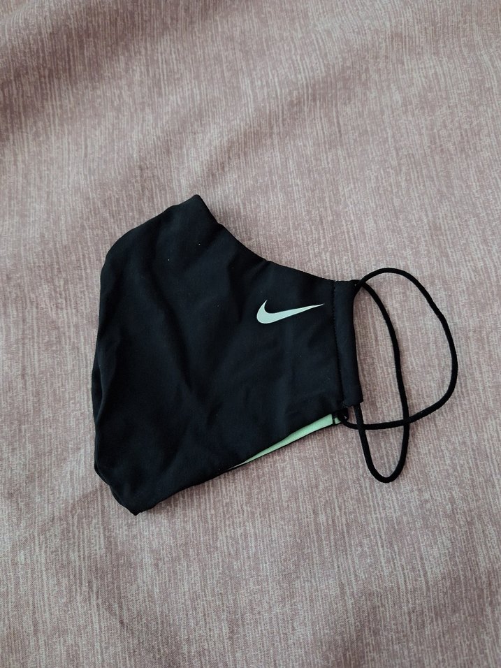 Ayarlanabilir kulak askılı, yan tarafında küçük beyaz Nike logosu bulunan siyah yıkanabilir maske. Günlük kullanım için uygundur.