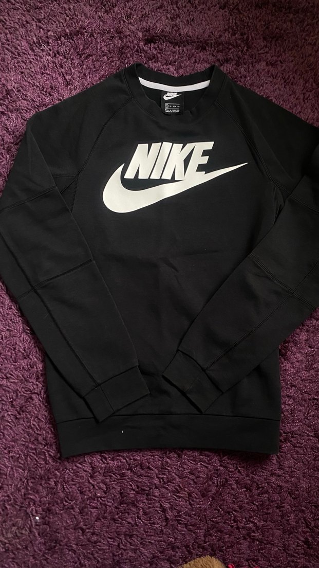 Nike markalı, uzun kollu, bisiklet yaka, baskılı logolu siyah erkek sweatshirt. Sentetik kumaştan, ayarlanabilir cırt cırt detaylı, sportif tarz için uygun.