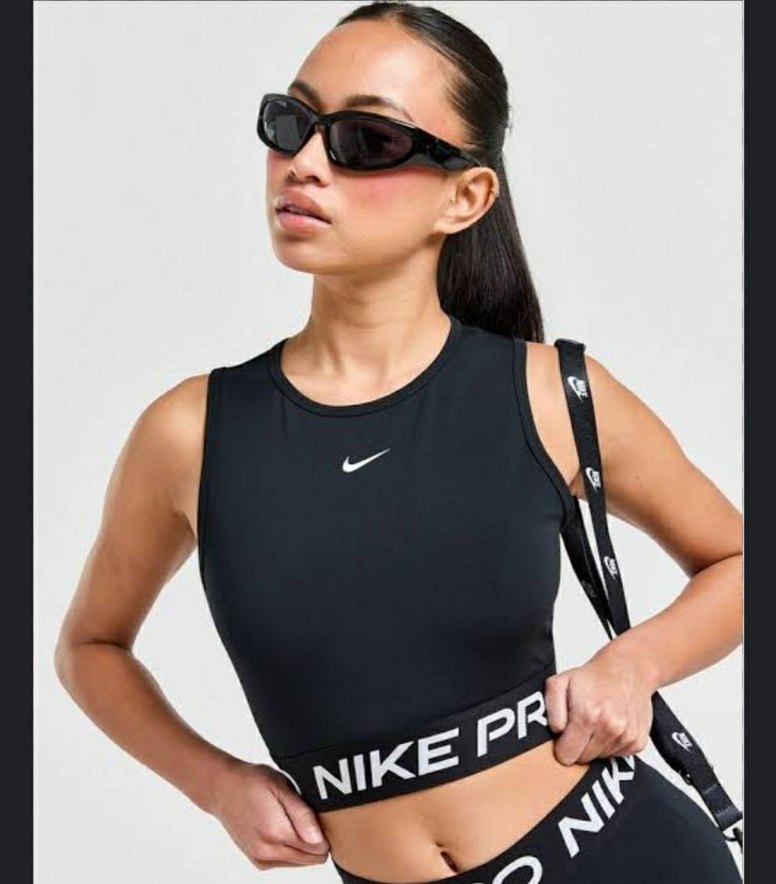Nike Pro siyah crop top, yüksek yakalı ve kolsuz, sıkı kesim. Sentetik kumaştan, baskılı logo detaylı, spor ve şık görünüm sunar. s ama m cok rahat giyer