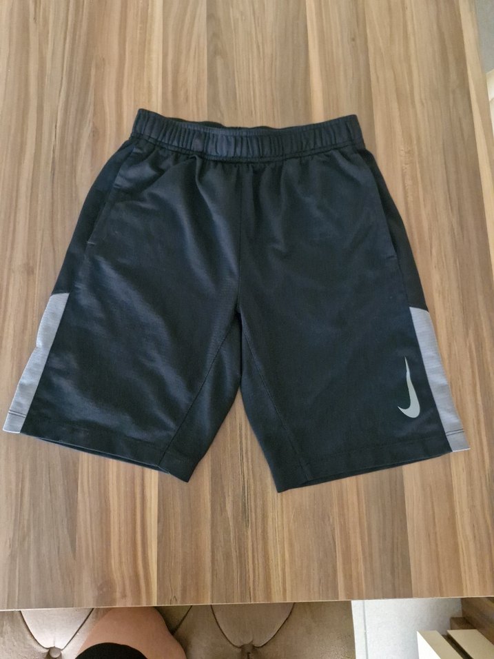 Nike markalı siyah spor şort, sentetik kumaştan yapılmış, elastik bel bantlı ve rahat kesimlidir. Desensiz sade tasarıma sahiptir. M beden (137-147 cm)