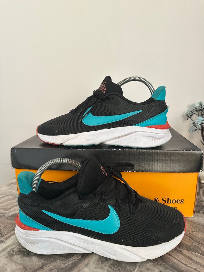 Erkek spor ayakkabısı, siyah taban üzerine turkuaz detaylar ve baskılı desen içerir. Bağcıklı ve dayanıklı kauçuk tabanlıdır, sportif sokak stili için uygundur.