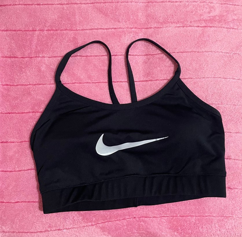 Nike spor büstiyer, ince askılı ve sade tasarımlı, önünde markanın logosu bulunur. Rahat bir kullanım sunar.