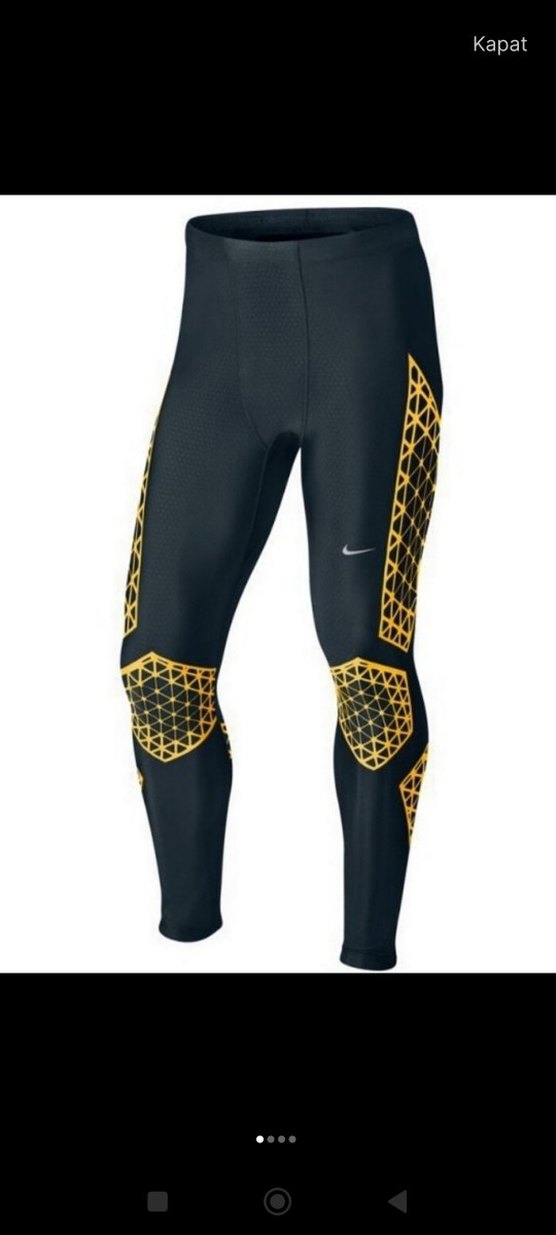 Sentetik kumaş üzerinde sarı geometrik desenli, elastik ve sıkı oturan spor tayt.