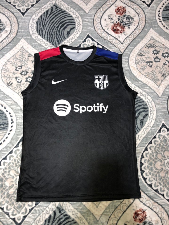Nike markalı, sentetik kumaştan yapılmış, Spotify baskılı, kolsuz ve fitted kesim erkek antrenman forma. Yuvarlak yaka ve kısa boyda, velcro detaylı. Ürün Açıklaması Ürün: FC Barcelona Spotify Sponsorlu Kolsuz Antrenman Forması / Tank Top Detaylar: • Renk: Ana gövde siyah; sağ omuz kırmızı, sol omuz lacivert detaylı (Klasik Barca renkleri). • Logolar: Göğüs kısmında beyaz Nike logosu ve FCB arması bulunmaktadır. Orta kısımda güncel sponsor Spotify logosu yer alıyor. • Durum: (Ürünlerimiz Yenidir Asla Kullanılmamıştır : "Sıfır", " • Kumaş: Hafif ve nefes alabilen, spora uygun kumaş yapısı. • Kullanım Alanı: Halı saha antrenmanları, fitness, gym veya yazlık günlük kullanım için idealdir.