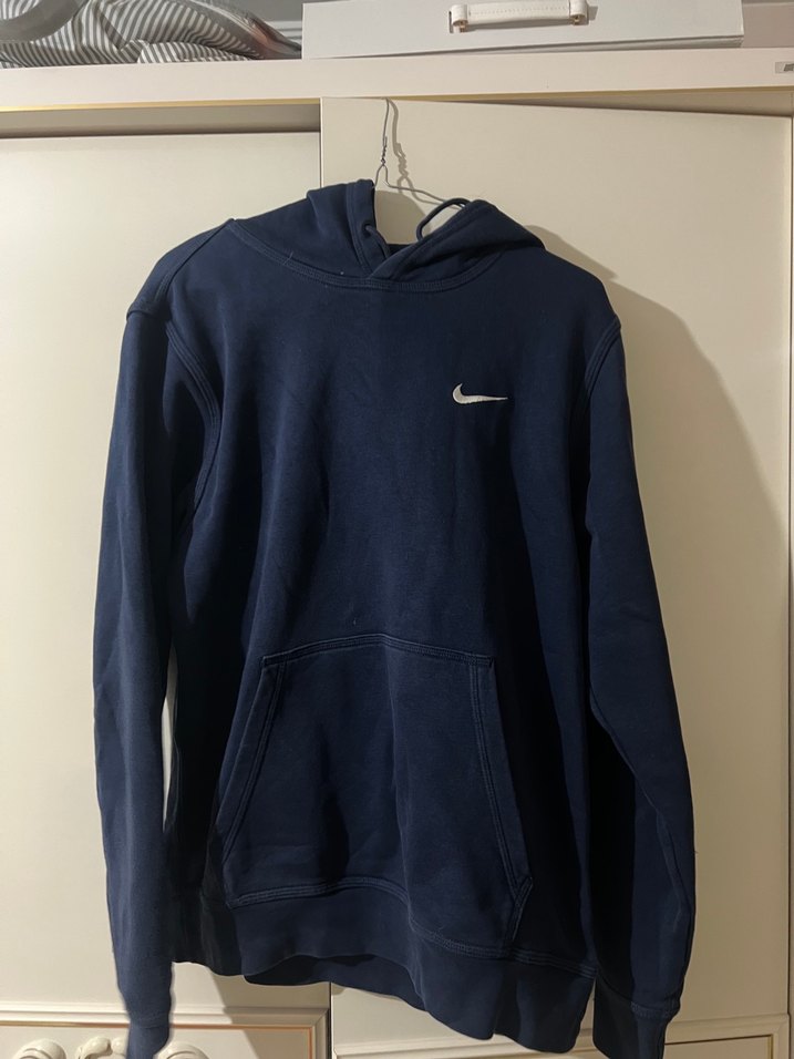 lacivert kapüşonlu sweatshirt, bol kesim, uzun kollu ve yuvarlak yakalıdır. Günlük kullanım için rahat ve şık bir görünüm sunar.