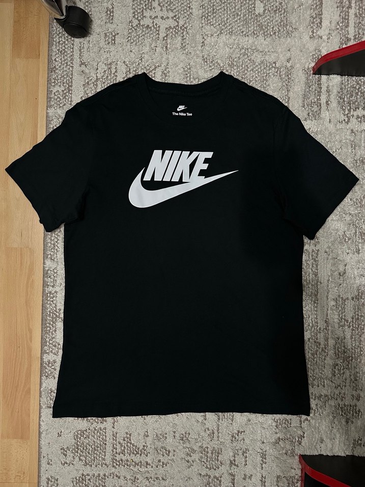 Nike siyah baskılı kısa kollu tişört, oversize kesim ve yuvarlak yaka ile. İpeksi dokusunda büyük logo baskısı bulunur. Spor ve günlük stil için uygun. 1 kere deneme amaçlı giyildi orjinal