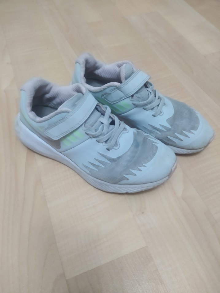 Nike marka erkek çocuk spor ayakkabısı, gri ve beyaz renkte, kaymaz kauçuk taban ve kolay kullanım için cırt cırtlı bant içerir.