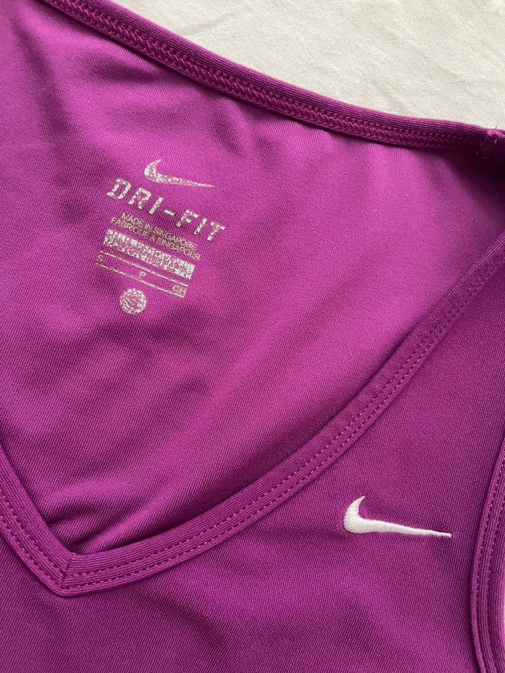 Nike marka, V yaka, mor renkli, askılı spor elbisesi. İnce kesim, parlak ve ipeksi kumaş, Dri-FIT teknolojisi ile rahat kullanım sağlar.