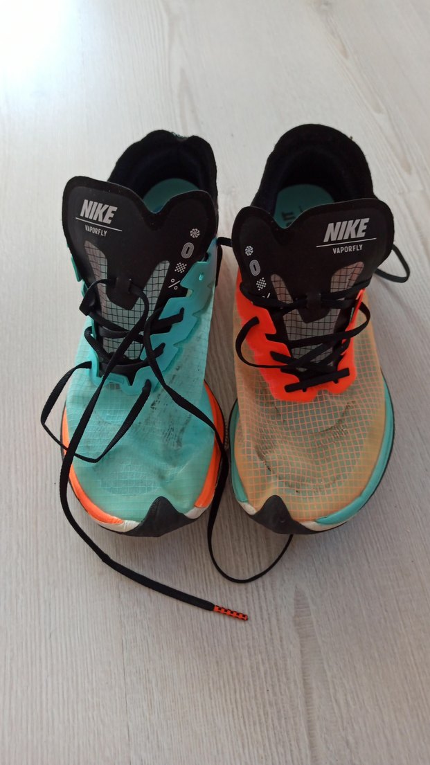 Nike VaporFly spor ayakkabısı, renkli tasarım, düz kauçuk taban ve bağcıklı kapanışa sahiptir, sokak stili ve spor için uygundur.