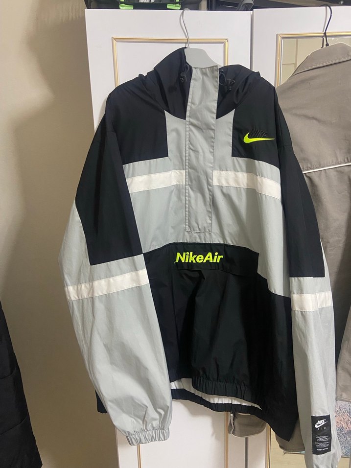 NikeAir erkek yağmurluk, yüksek yaka, fermuarlı ve bol kesim, gri ve siyah sentetik kumaştan, neon sarı detaylarla.5-6 kere giyildi ürün orjinaldir