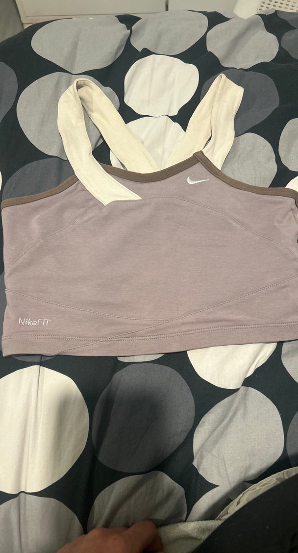 NikeFIT logolu, geniş askılı bej spor sütyeni. Normal uzunlukta, sokak stili ve athleisure için uygun. ️♀️