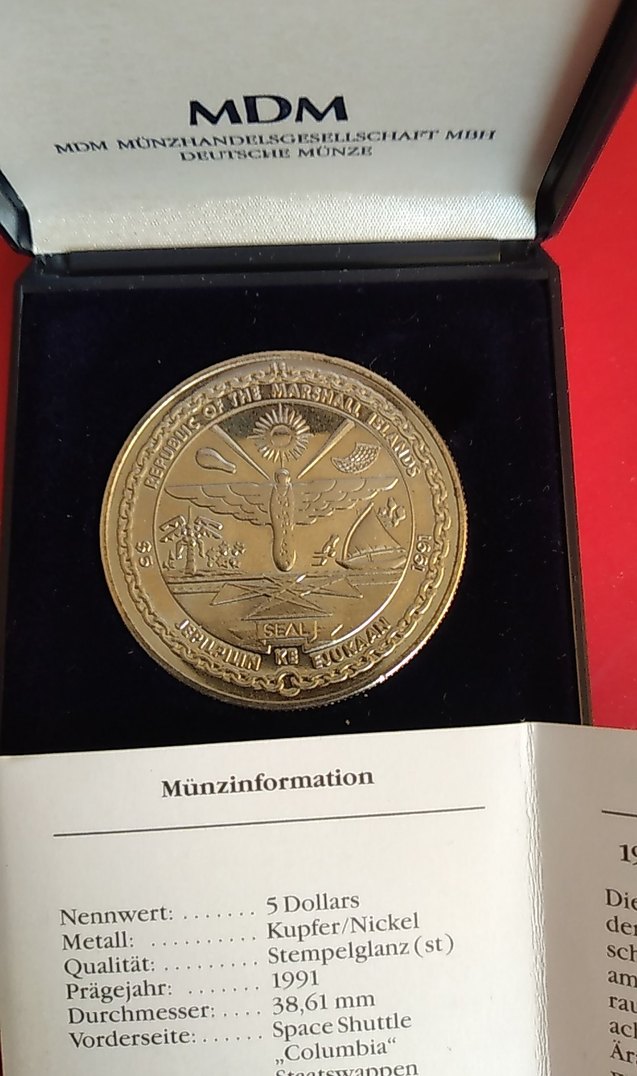 Parlak altın renkli erkek rozeti, vintage tarzda olup bakır ve nikelden yapılmıştır. 5 dolar nominal değeri ve damgalı parlak yüzeyi vardır.