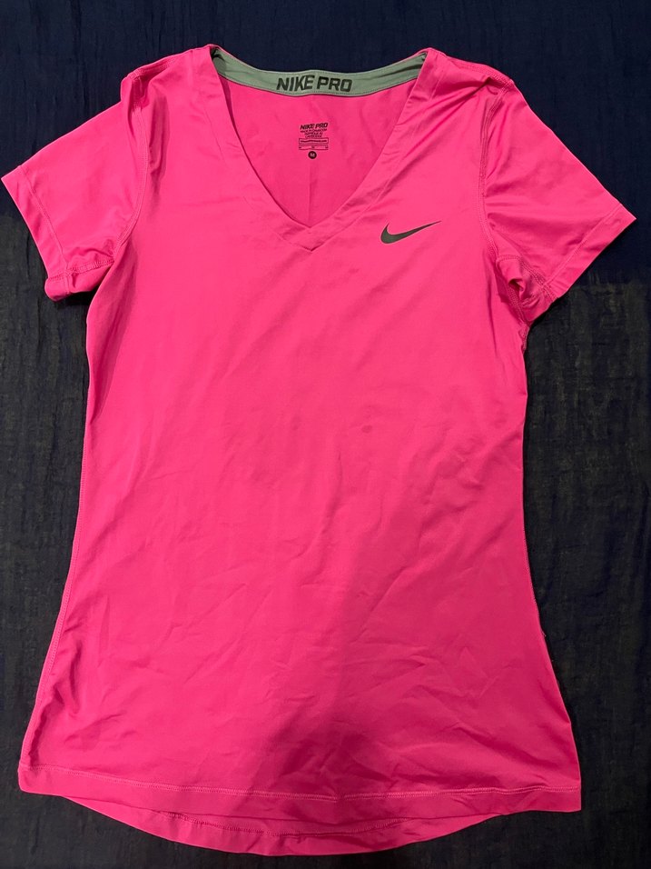 NikePro marka, pembe renkte, V yaka ve kısa kollu, ipeksi dokulu, dar kesim kadın tişörtü. Spor ve sokak tarzına uygun.