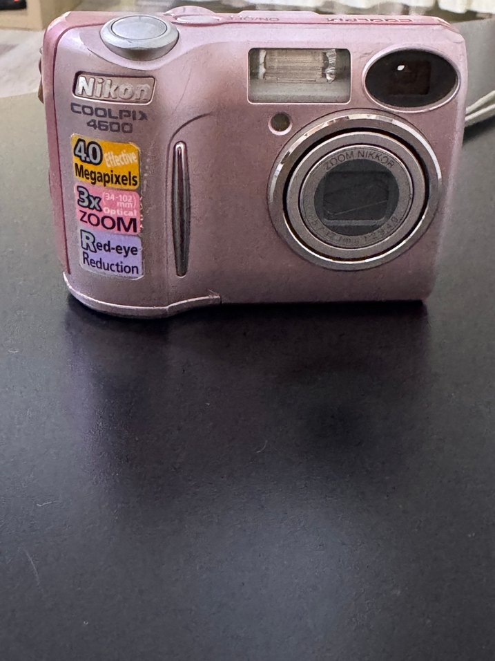 Nikon COOLPIX 4600 dijital kamera, 4.0 etkili megapiksel, 3x optik zoom ve kırmızı göz azaltma özelliklerine sahiptir. Pastel pembe renktedir.