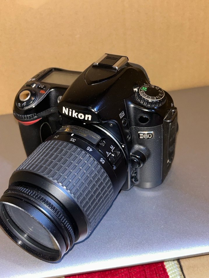 Nikon D80 dijital fotoğraf makinesi, siyah gövde ve zoom lens ile çeşitli çekim ayarlarına sahiptir. Çanta şarj aleti ile verilecek