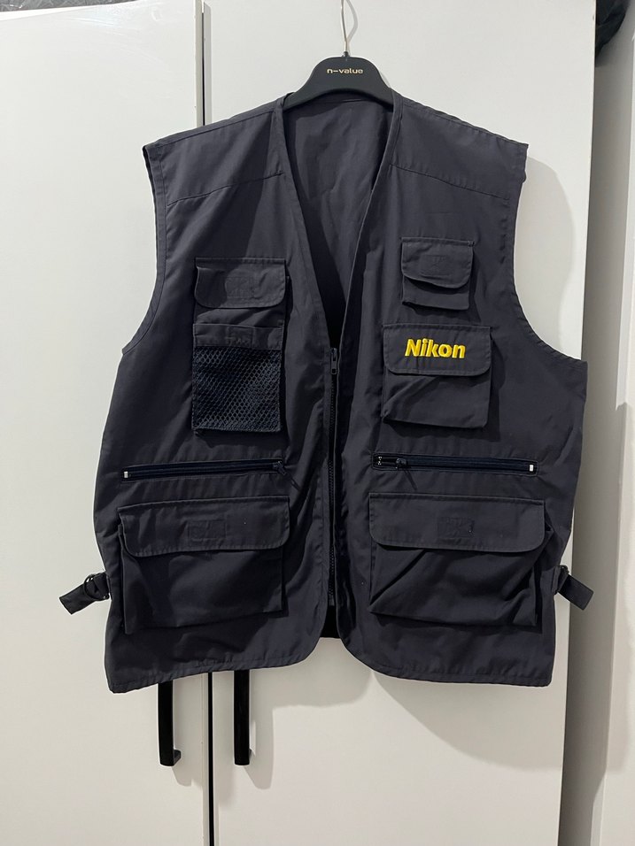 Yumuşak kumaşlı, kolsuz siyaha yakın füme yelek, çıtçıtlı çoklu cepler Nikon baskılı, günlük dış mekan kullanıma uygun. XL - xxl beden