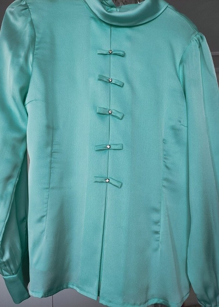 Taşlı Nil yeşili saten tril tril bir bluz. Dolabımı boşaltıyorum o yüzden de uguna veriyorum ürünün kolunda leke oldu yıkanınca çıkar. Sadece bir kez yemekte giyindim. yemek lekesi oldu sanırım.