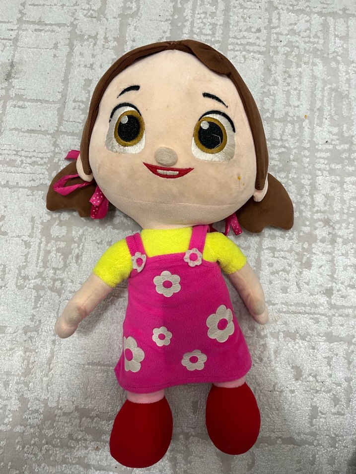 Yumuşak peluş oyuncak, pembe elbise, sarı tişört ve kırmızı ayakkabılarla renkli tasarıma sahip. İşlemeli yüz detayları ve pembe kurdeleli kahverengi saçları var.