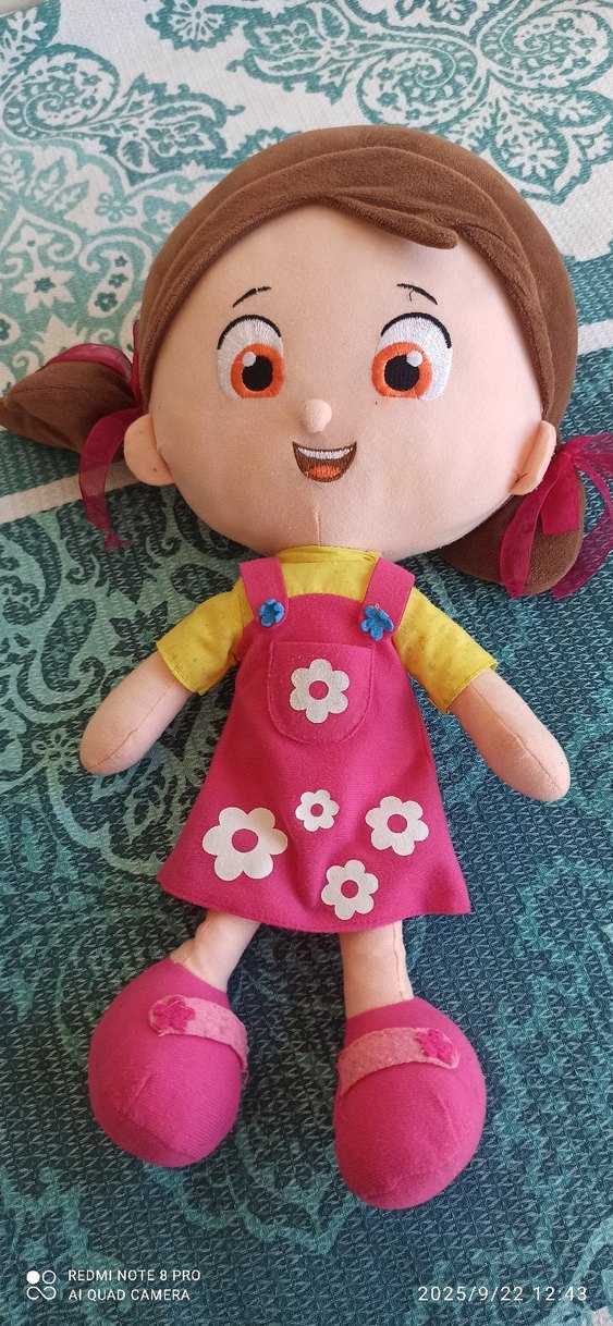 Pembe elbiseli, beyaz çiçek desenli ve sarı tişörtlü renkli kız peluş oyuncak. Yumuşak, nakışlı yüz ifadeli ve pembe kurdeleli kahverengi saçlı.