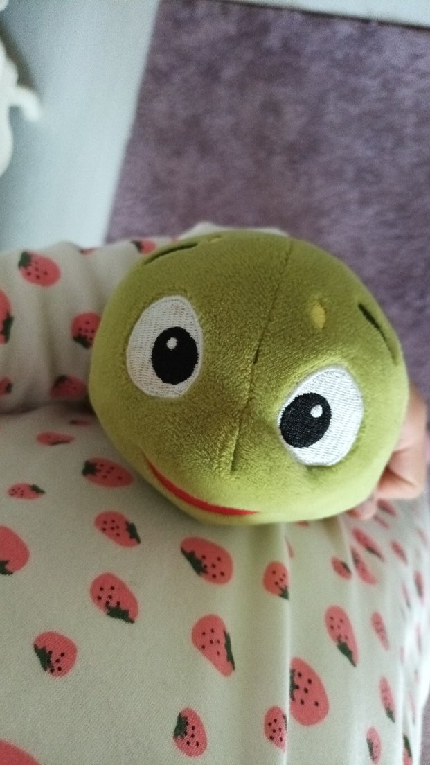 Renkli yeşil peluş oyuncak, işlenmiş gözler ve gülümseyen ağız detayıyla yumuşak kumaştan üretilmiştir.