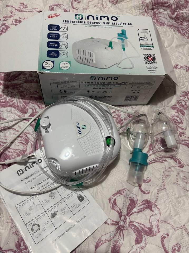 Nimo beyaz kompakt mini nebulizatör, etkili ilaç iletimi için kompresör içerir. 2 adet Maske bulunmaktadır. ️Çalışıyor, hiç bir sıkıntısı yoktur. Az kullandık