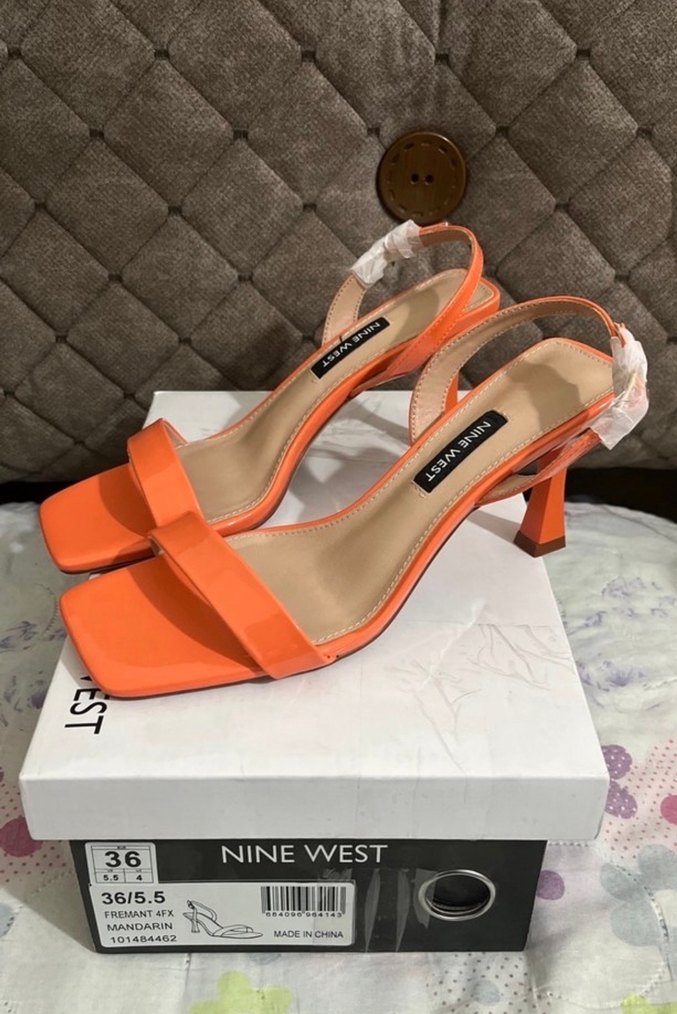 Minimalist ve çağdaş turuncu parlak lastik stiletto topuklu, tokalı kadın ayakkabısı. Marka: Nine West, numara: 36 ve 37 mevcut