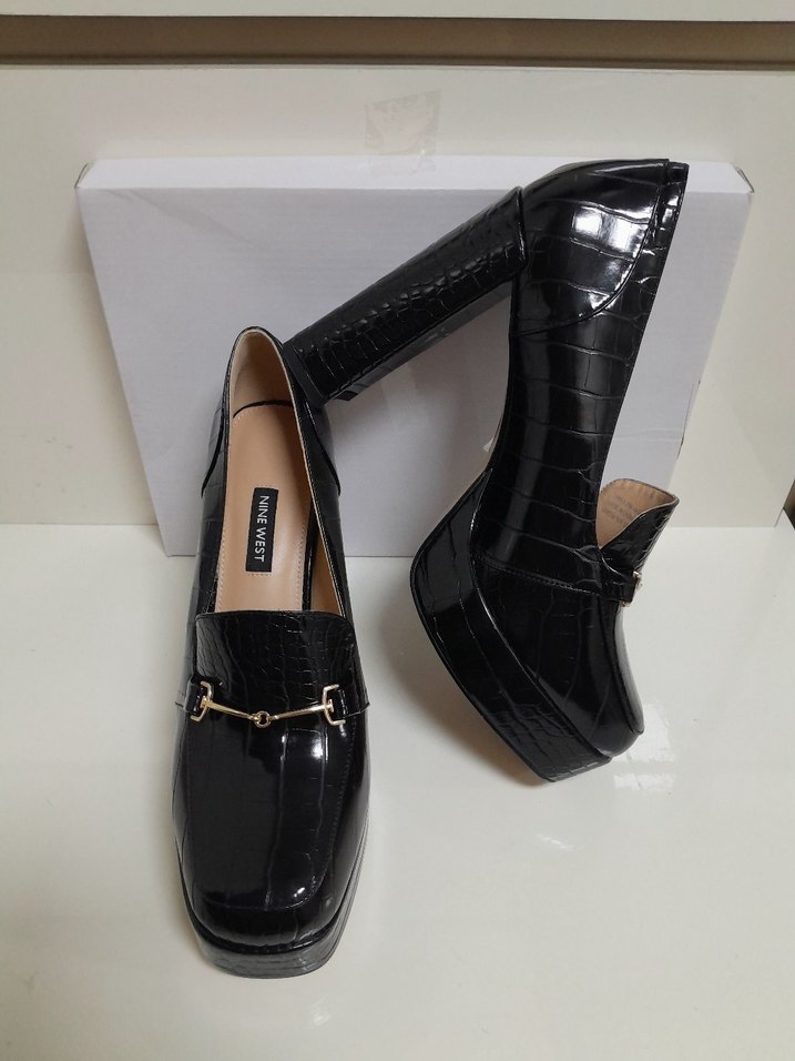 SIFIR KULLANILMAMIŞ ETİKETLİ NİNE WEST 40 Siyah parlak deri platform topuklu, blok topuklu ve tokalı detaylı, yılan derisi desenli. Ofis için klasik şıklık sunar.