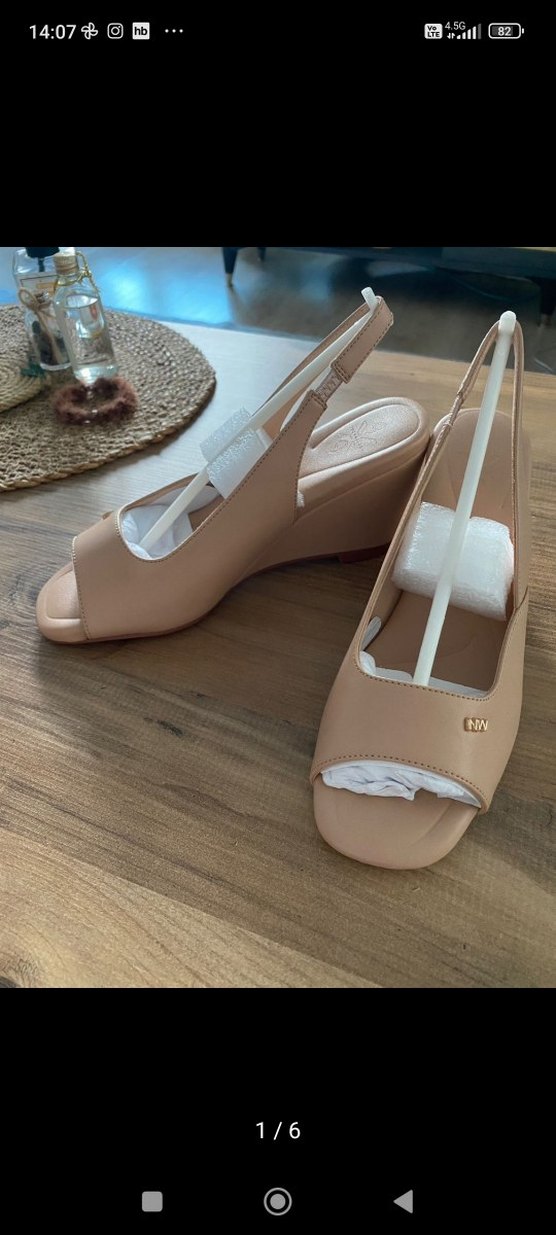 Bej renkli, dolgu topuklu kadın sandalet. Minimalist sahip, kemerli ve kauçuk malzemeden üretilmiştir. Günlük kullanıma uygundur.