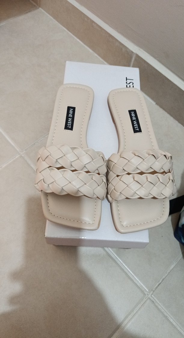Nine West markalı, bej renkte örgü detaylı ve blok topksuz kadın terlikleri. günlük rahat sokak stili için uygun.