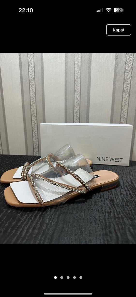Nine West kadın bej terlik, stiletto topuklu ve parlak taşlı kayışlara sahip, kauçuk tabanlı günlük rahatlık sunar. ✨